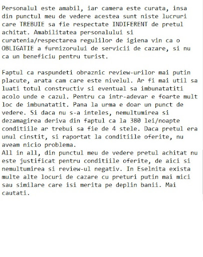 Raportul calitate-pret mult sub nivelul acceptabil. LOCATIA: - este foarte dubioasa, am gasit-o cu greu. Am trecut de 2 ori pe langa ea. Nu arata ca un SPA/Hotel. CAMERA: - mobila este de proasta calitate, sifonierul fara usi, am primit un pat suplimentar pentru copil extrem de prost, din fier, pliabil, cu o saltea subtire pusa peste, care a scartait constat. La orice miscare aveam senzatia ca o sa se rupa. Mentionez aici ca am avut parte de cazari cu preturi mult mai mici si la care am beneficiat de un pat mult mai ok. Baia foarte mica, fara cabina, dusul agatat in perete si un mic covoras pus langa usa. Cand faci dus apa ajunge pana aproape de usa, astfel ca acel covoras este inutil pentru ca se uda. AER CONDITIONAT in camera inexistent. Nu am umblat la termostat, pentru ca asa ni s-a spus. Temperatura in camera a fost pe tot parcursul sejurlui de 28 grade Celsius. Am rugat inca de la inceput setarea temperaturii la 20 grade Celsius, spunandu-ni-se ca se va atinge aceasta temperatura. Nu s-a intamplat acest lucru. Ni s-a indicat sa deschidem geamul din tavan dimineata si seara pentru ca "se face mai racoare". Exact asa am procedat. Zero efect. A existat o aeroterma pe hol care facea zgmot, dar chiar si asa ineficianta pentru ca era mult prea mica pentru spatiul respectiv si oricum nu poti sa ti usile deschise nici cand esti plecat din camera si nici cand dormi pentru a beneficia de efectul acelei aeroterme. MANCAREA: - am avut mic-dejun inclus: calitate low - 3/4 felii de salam de calitate foarte proasta, o jumatate de rosie, un ou fiert, o bucatica foarte mica de branza si painea. Am fost intrebati daca dorim ceai sau cafea. Am crezut ca erau incluse in costul micului dejun, insa am achitat separat si ceaiul, si cafeaua la decazare. Ni s-a spus la cazare ca aveam si varianta de a manca la pranz/cina in cadrul hotelului, pentru ca se poate gati mancare de tip fast food. In prima seara, ajungand tarziu, abia in jurul orei 9 am hotarat sa cobor sa intreb ce variante avem pentru a servi cina pentru ca primisem si niste pliante cu meniu. Raspunsul a fost: "Ati sunat sa va comandati?" Moment in care am avut un blocaj, reverificand pliantele, am constatat ca erau de la o pizzerie sau ceva restaurant din Orsova, si ar fi trebuit sa facem noi comanda si sa "mergem sa o ridicam de acolo".A doua seara, in jurul orei 18:00 am intrebat ce variante de mancare avem daca dorim sa servim cina acolo. Variantele prezentate: snitel de pui, piept de pui la gratar, ceafa de porc, ceva crispy de pui cu garnitura: cartofi prajiti/nature/piure si o salata de rosii cu castraveti si ceapa. TERASA amenajata afara: Se poate observa si in pozele atasate de ceilalti utilizatori, e o improvitatie cu scaune, mese si umbrele, exact ca la carciumile de la coltul strazii de la tara. Ceea ce n-ar fi o problema. Dar, cand platesti 380 lei/noapte... te astepti la niste conditii. Niste sezlonguri intr-un colt. Nu este suficeint spatiu pentru plaja daca sunt mai mult de 5-6 persoane care doresc sa faca acest lucru concomitent. Mai ales in contextul situatie epidemiologie actuale, in care este necesara respectarea distantarii sociale, si pana la urma si a unui grad de confort si intimitate. SPA -ul: cuprinde piscina interioara, un jacuzzi, sauna si un vestiar. Acest spatiu este practic mandria proprietarului, pentru ca asta s-a bagat la inaintare in justificarea pretului atunci cand am fost vadit dezamagiti la cazare. E o piscina, si un jacuzzi si o sauna, nu are nimic special. Nu justifica pretul. Pro: accesul se face la orice ora. VESTIARUL este extrem de mic, are o singura banca si o singura priza dupa usa, foarte prost amplasata (te poti trezi cu o usa in cap). Dusurile sunt ca la camin, aplicate pe perete, in numar de doua situate unul in fata celuilalt, fara usa nici intre ele si nici la intrarea in ele (nu exista cabina inchisa pentru asigurarea intimitatii). Nu exista oglinda. Nu exista uscator de par. A trebui sa solicit la receptie un uscator de par pentru a-mi usca parul in vestiar, la priza situata in...