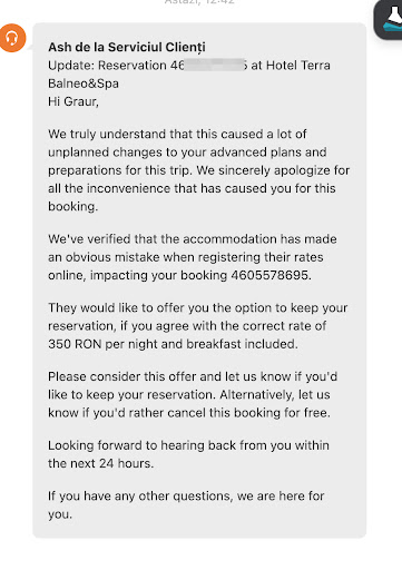 LAter edit: I don't know how to take this...? Is this a joke? If so, it's one I didn't laugh at. So the "normal" price is 350 RON/night and you magnanimously offer me a discount to pay only 350 RON/night? The middle ground between 350 RON and 350 RON is... 350 RON? I have nothing to comment, everyone thinks...