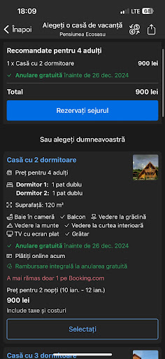 Am inchiriat cabana pentru 4 persoane , voi expune opiniile mele despre aceasta cabana Mi a placut : -Lenjeriile erau curate -apa calda si caldura erau permanente -privelistea draguta -curtea spatioasa -au tv in toate camerele Nu mi a placut : -ni s a cerut mai mult cu 100 lei fata de pretul afisat pe booking -una dintre camere este foarte mica , nu are sifonier sau un dulap in care sa ti pui hainele -plita din bucatarie lasa de dorit , stai 10 ani ca sa incalzeste ceva pe ea -tacamurile si vesela nu erau curate -pentru ultima zi am intrebat daca se poate sa lasam pisica in baie 1-2 ore peste ora de plecare pentru a nu o lua cu noi cat mergem la mocanita , nu ne ar fi deranjat daca ni se raspundea direct ca nu se poate , doar ca proprietarul a bagat scuza ca nu avem cum sa o lasam ca ei trebuie sa faca curat pentru ca au cabana ocupata dupa noi in acea zi si ca daca vrem sa mai luam o noapte si ii muta in alta cabana pe cei care aveau sa vina , dar defapt cabana nici macar nu era...