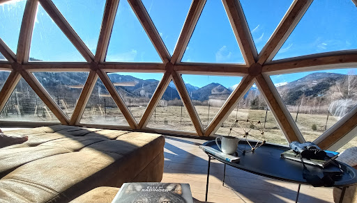The dome is an architectural masterpiece, unique in the country, situated in a breathtaking location. Access is easy, directly from the main road, and the interior is designed to offer an unforgettable experience. The structure features two elegant, modern-style bedrooms on the ground floor and a third open-space bedroom on the upper level.