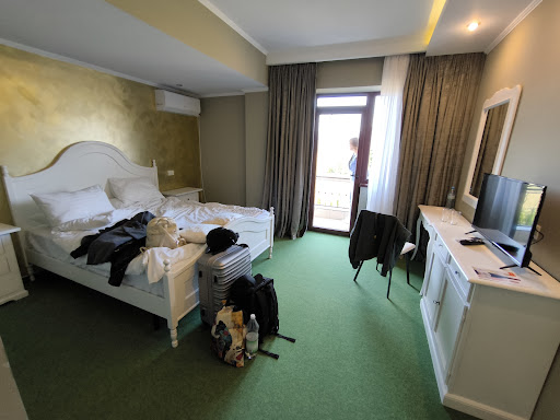 Cel mai rau hotel la care am stat in ultimii ani, a fost caricatural de rau, aproape chiar amuzant. Camera nu fusese curatata bine cand am ajuns - aveam un pet gol dupa perdea, niste mancare lipita pe perete, o sticla de kefir napolact cu ceva lipicios pe fund in frigider si scrumiera plina pe balcon. Dusul abia curgea si era ruginit peste tot oricum. Usa camerei prietenilor nostri nu se incuia si avea o gaura, semn clar ca cineva a stricat-o la un moment dat dand cu piciorul in ea. Per total, vai de capul lui hotelul, se vede ca n-a mai reparat nimeni nimic la el de prin 2001. Nu, mint, se mai fac renovari la hotel si am avut privilegiul sa asist personal la ultima dintre ele. Sambata dimineata la ora 9, m-am trezit in camera de hotel pe fundal de bormasini. Credeam ca e un santier langa hotel, dar, cand ies pe hol in chiloti, vad vreo 4 muncitori instaland aer conditionat in toate camerele de pe etajul meu. Evident ca n-am mai dormit, dar macar nici nu si-a cerut nimeni de la hotel scuze.