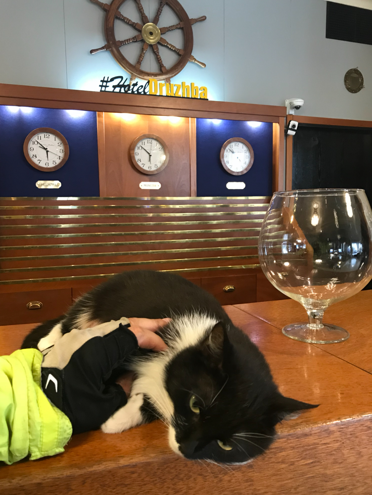 As I waited to check-in the ship’s cat attracted to my rather unusual smelling clothes took position on the reception desk for a stroke and purred as I scratched behind her ears.