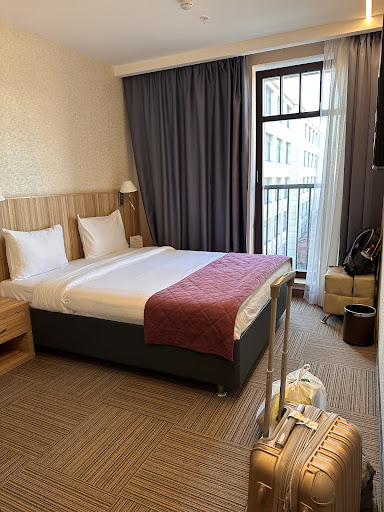 Nice new hotel off the city center! Our room was big and spacious. The huge windows spent lots of day light into the room. The bathroom provided all necessary toilette articles including tooth brush, shampoo, etc. Coffee, tea, water bottles and water heater are available in the room. Also iron and safe. The king size bed was very comfortable. We slept very well in it. Englisch speaking and helpful receptionists. Else, it was very clean everywhere also the toilettes in the lobby.