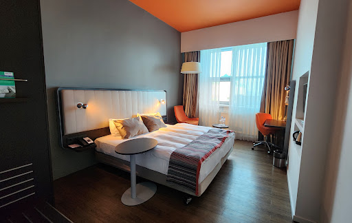 Read moreХорошая гостиница. Жили в ней с коллегами (человек 10) 5 дней в конце августа 2023 года. Расположение. Гостиница находиться практически в центре города. На такси 100-200 рублей и ты в центре. Персонал незаметный. Уборка в номерах нормальная. Номера хорошие. Не замызганные. Но очень темные, всему коллективу не хватало освещения в номерах, за это снимаю одну звезду. В номере шампунь, кондиционер, гель для душа в деспенсере на стене в душевой, набор для чистки зубов, мыло, одноразовые тапочки, набор для ухода за обувью, швейный набор. Так же по запросу могут предоставить бритвенный набор, шапочку для душа и халат. Вода с газом и без, чайник, чай, кофе, посуда, салфетки. Есть сейф, но нет холодильника. Хорошие завтраки в формате шведского стола. Есть каша, омлет, яичница, бульон, вареные яйца, сухарики, различные овощи, несколько видов колбасы, сыр, сельдь, сосиски, творог, йогурт, молоко, кефир, сладкая выпечка, фрукты, тосты и т.д. Кофемашина, чай, компоты, лимонады. Главной фишкой завтрака является возможность взять горячий кофе в стаканчиках с собой. На первом этаже есть бар и ресторан. Через дорогу от входа в гостиницу в черном стеклянном здании находится выставка ретро автомобилей. Через дорогу, если выйти из гостиницы и повернуться на право. В домах множество ресторанов, шаурмячная и продуктовые магазины. Если выйти из гостиницы повернуть два раза на право (за углом в этом же здании) найдете отличный алко маркет. За гостиницей прекрасный парк. Ресторан при гостинице может, как порадовать так и огорчить. Наша команда там отиграла со счетом 1:1....