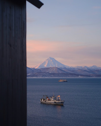 Просыпаешься, еще темно. Видишь в окне корабли вдали. Фонари с палуб бросают дорожкой свет на воду. Прорисовывается на фоне - могучий Вилючинский. Бежишь вниз, потому что глазам не веришь. Наливаешь горячий чай, открываешь дверь, чувствуешь мороз по коже... Пейзаж из сказки перед тобой. Это всё правда, это всё настоящее.