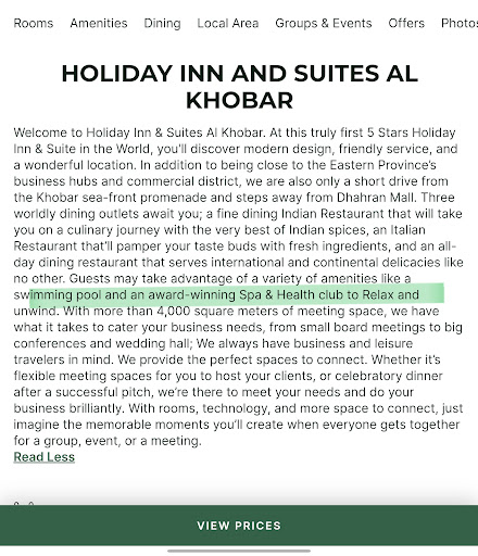 I travelled from the UK to saudi arabia for a holiday. I chose holiday inn as it had exactly what I was looking for when I saw it online. It ticked all the boxes and I was willing to exchange for the services that they had. I wanted a hotel that had SPA facilities and a swimming pool as part of the service package.