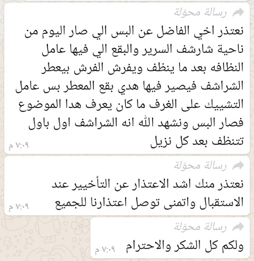 ومن خلال تلك التجربة ظهر لي مثالين للعمالة احدهما قمّة في الأخلاق والأدب وهو ((شهاب الدين)) والآخر لم يكن اسلوبه لطيف ويرد بتعالي، وتكرر منه ذلك وهو ((ريفان)) وتم ايضاح اساءة العامل للاستقبال.. وأسأل الله أن...