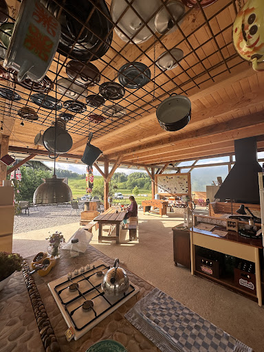 The shared bar/kitchen area had one really cool feature we hadn’t seen before: a self-service system. You grab drinks or snacks from the fridge or cupboards, write down what you took in a ledger with your name, and pay when you leave. The prices were reasonable too — not cheap, but fair for a campsite setup.