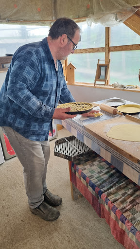 Donderdag 30 mei 2019 Hemelvaartsdag We hadden afgesproken met de campingbeheerders om een dag mee te gaan zodat we een beeld krijgen hoe de mensen op het platteland van Slowakije leven. We vertrokken tegen 11.00 uur en kregen eerst een borreltje met een stukje spek. Het weer was nog steeds regenachtig. De eerste stop was bij een mevrouw die oude weeftoestellen had en daar hele mooie kleden op maakte. Dit was geen weven met garen met lappen gescheurd van diverse kleuren stof. Dus eigenlijk hergebruik. We kregen daar koffie met eigengemaakt gebak en hebben her een en ander verteld hoe het leven in Slowakije is en het leven in Nederland. Daarna zijn we naar een echtpaar gegaan die van klei bekers, bloemen, maar ook miniatuurhuisjes maakte. We kregen daar ook weer thee met eigengemaakte taart. De reis vervolgde naar een bakkerij waar het brood met de hand werd afgewogen, gekneed en in vormen gedaan. Daarna kwam het in een hout gestookte oven kwam en met een lange stok en een platte vorm naar binnen werd geschoven. De broden werden na vijf minuten verplaatst naar de andere oven de broden die nu vooraan lagen werden in de andere oven nu achteraan geplaatst. Heel intensief werk en dit kom je in de westerse landen niet meer tegen. Een brood waar zoveel werk op werd gedaan wordt verkocht voor 1.50 euro.