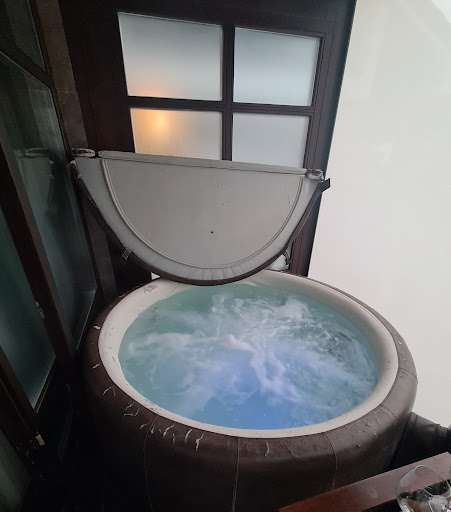 K dispozici sme mali chodbicku so skrinami, predsien , oddelene wc , kupelnu , malu kuchynku s mikrovlnkou a ladnickou plus zakladne vybavenie , pohodlnu obyvacku s Tv , jedalensky kut, spalnu s Tv a ceresnickou na torte privatnou jakuzzi na terase :) + zupany , uteraky , papucky..