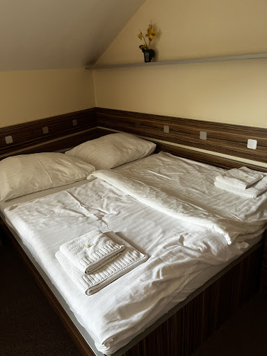 Room was clean, 🧼 bar soap, drying machine, shower no humidity, really clean, sheets only were kind of looked like second time use(?), covers ok, very big pillows (I am not a fan), doors which falls down when close so if one does not keep them on the hall ppl make noise with the doors. We had bad luck first night, family with 3 kids running around the room till 23:00, so we could hear even their words. Next night perfect, because no neighbours, very calm. Kettle for hot water and microwave to disposition only next to the reception. In the hall ping- pong and table for drawing for small kids and coloured crayons. Reception does not speak English but they use translator.In case if you are polish or czech then you will manage to understand each other. Breakfast need to be ordered from card day before. Breakfast is not a buffet they bring to your table. If you order 3 butters you get 3 butters that's it and no more. So you need to order breakfast in details also like tea, coffee. All in all people nice, older stuff but sympathic,can see that they try their best :) so 4 stars for people who might expect this penzion as a welness hotel: no there is no swimming pool, only small sauna opened on the demand, so it will be far away from considering this place as a wellness. If then you come just for sleep, very good clean and comfortable, silent if you...
