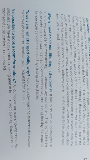 The BAD: they didn’t provide any bed sheets to our 2.5 years old child, even though we ordered two bedroom apartment with 4 sleeping places. When we asked for an additional set, the required to add payment for an additional person, with additional 15€ per day! Eventually, we got a baby crib and used its pillow and blanket. YOU CAN’T simply change to a clean set of towels. They are cleaning the room and changing the towels only once per 3 nights. Since my wife didn’t feel good on the 3rd day and we asked not to disturb us, we had to ask later 4 times until we eventually managed to get a clean set of towels. The bathroom constantly had A BAD SMELL even though we kept it ventilated. THEY DON’T change the bed sheets. Even after we asked at least 4 times, they didn’t accept to provide us a new set of bed sheets. THERE’S NO enough hot water, especially at the morning or night. Unless you prefer to have a shower after lunch, be prepared to have a cold shower. THEY DON’T have neither a safe box nor a...