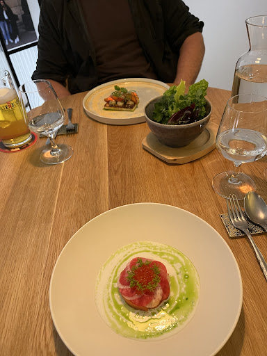 The trout with white radish, kefir, caviar, dill and hazelnuts opened the evening like a fresh breeze brushing across a mountain lake. The cow cheese dish, adorned with nectarine, greens, cucumber and sunflower seeds, was a hymn of subtle sweetness and garden freshness.
