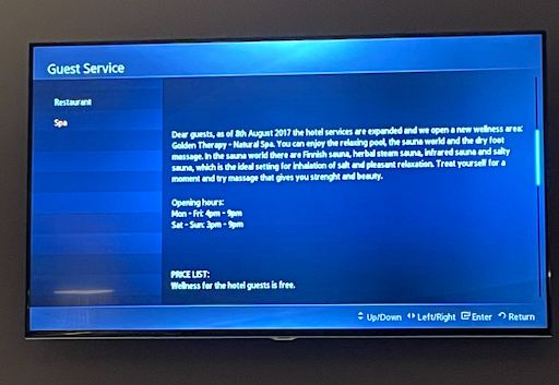 Cons: They heavily advertise their wellness centre, it's open for 4 hours only. Also, you can't easily enjoy it without prior reservation. We received information about additional payment of €20 per person to use wellness centre at the reception, haven't see this information prior booking. Their website and internal hotel TV is outdated as it informing about different opening times (4pm to 9pm) and even (3pm to 9pm) during the weekends, and that's the wellness centre is free of charge which is not true. There was no menu in English at their restaurant, the waiter wasn't able to explain in English what in their card. Due to this fact, we didn't taste the food. Despite the cleanliness, they should properly descaled shower heads. The water is running only through some of the holes causing higher pressure and the water is running into different directions. The AllSync from samsung TV is deprecated and not supported since 2020, why are they still recommending it to the customers? Maybe TV software update? I watched things on my laptop instead
