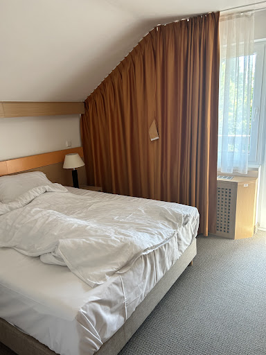 Utensils and Comfort: The mattress on the bed is quite hard and potentially uncomfortable if that is not your thing. The bed is also quite short, I am not that tall (177 cm) and I barely fit length wise. There is a lot of storage space in the room and a big couch in the living room to lounge on, even though the cushions do slide off easily. However, when we tried to make a meal in the kitchen, there were a lot of difficulties. The electric stove is confusing to use, there are some missing utensils and the refrigerator is not on originally, so it took some time for it to cool. There are lots of great restaurants in Bled, so I recommend just eating out. The bathroom is a little small, there aren’t many issues when just using it for vanity, but the shower is a little uncomfortable since it is not very spacious and only has a moving door that doesn’t keep the water in sufficiently. It also varies in temperature when on, which is not ideal. The hotel does provide a swimming pool in its sister hotel, which is very big and has lots of tanning beds, some with beautiful views!