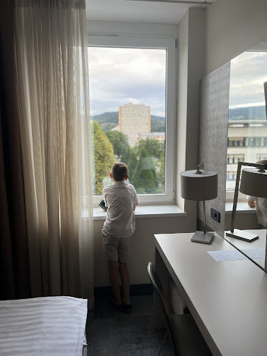 My wife and I stayed 1 night, arriving by rental car at 3PM and parking in front. A gentleman receptionist copied our passports/vaccinations, told us about breakfast and WIFI, then pointed to the 2 elevators. Room #401 was a newly renovated carpeted suite, a deluxe accommodation with 2 TV’s with guide(BC/CNN and more in English), minibar and 3 large opening windows with view of the castle.||One room had a comfortable queen, a fully outfitted bathroom with a small shower and a convertible couch in the 2nd room.||The 6:30 AM breakfast buffet held in their restaurant was serviced and complete with juice, eggs, cereals, meats, smoked salmon, breads, yogurts, cheeses with coffee/tea, and fresh fruit.||This 53 room business hotel built in 1961 is located in the town center 1 block from the Mercator Supermarket. Its quiet with good secure WIFI, has a nice cafe with desserts and gelato and makes for a...