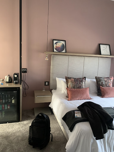 More details: Staff and management are extremely friendly and helpful. They even helped us with a recommendation for a very good restaurant in the area and took care of reservations and transportation. We were picked up on time at the airport with a nice and spacious German car that fit our large luggage. The hotel is only 2 minutes down the street. It has a very modern and appealing space and moon landing theme and is decorated with great attention to detail. The rooms are spacious and clean. There is plenty of room to unpack and a comfortable bed to rest in. The bathroom is very large and has everything you need. A big shower, a bathtub, more than enough towels and good cleaning products too. We slept like a baby and were shuttled to the airport very early in the morning. Even that early we were offered breakfast, but we declined gratefully and enjoyed a wonderful cup of cappuccino instead. Although it was a very short stay in nøva, we can definitely recommend this place and would like to thank Gale, her husband and the wonderful staff for a very...