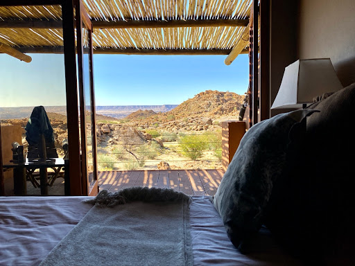 Read moreWe stayed for 2 nights in January on our 11th annual road trip, which encompassed 15 properties over 26 nights, so this review is relatively objective.||||Easily found/signposted along the gravel R359 from the Augrabies direction, which has recently been graded and is in excellent condition.||||Made very welcome by Leah & Eugene.||||The secluded rooms remain in good condition and once again it was a delight to sleep with the bi-fold doors open to the night sky stars.||||Leah's catering continues to be to a very high standard with excellent wine provided and the honesty bar well stocked.||||The property is remote and off grid, so do not expect aircon and kettles in the rooms. Despite the high temperatures at this time of the year, we found fresh air and a fan more than adequate at night. Hot water flasks for the obligatory early morning coffee on the balcony overlooking the Orange River Valley/Namibia escarpment more than sufficed.||||An ideal picnic spot on the grassy banks of the Orange River is no more than a 15 minute drive away along a farm track - my 'soft' SUV with 4X4 managed this without any problems at all.||||The highlight of our trip was the Sundowner - somewhat of a rough track trip to get to the highest local hilltop, but more than rewarded by a stunning sunset over the mountain tops accompanied by a cold one. An enroute bonus were sightings of desert hares & Klipspringers. ||||There is limited wifi in the main building.||||Still highly...