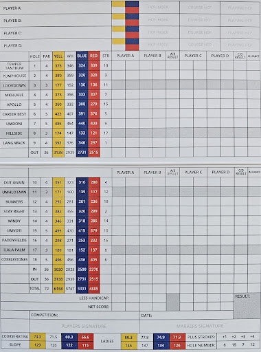 Now, why this beautiful golf course is not for us: Earliest kick-off is at 7, long after sunrise which is a moderate problem that we know from other South African courses. Not moderate at all is this: We like to play a spontaneous 19 to 27 in the afternoon. Actually no problem: 4 hours before 6:45-sunset, you only see one or two residents of the surrounding houses teeing off with their own carts. Such a pity, this almost unplayed course at this time of the day. For us guests, carts are no longer available after 2:45! The supposedly reason is that the staff leaves at 4:30 and can't take any carts back. For us, this was a big surprise that we didn't know from other South African clubs and would have been a knock-out-criterion for our booking. We could book the 9 holes and carry our bags - no chance with big distances between holes, afternoon heat and slowing down possible traffic behind. The 24-7 lodge reception in the same building could easily accept the cart key after the round. The manager might consider this, based on our recommendation. But that's of no use to us, who booked four months earlier and traveled 11000 km to play 27 holes here instead of...