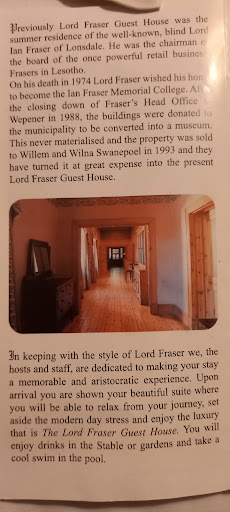 Read moreThe Lord Frazer guesthouse run by Addie and owner Wilna, is a perfect gem of a hotel. Old style charm, great service, stunning rooms (ours had a beautiful fireplace) and lovely bar. This hotel unfortunately is a located in a town that is almost completely destroyed. Most of its historic buildings have been burnt to the ground and the place is littered in the worst trash imaginable. The Lord Fraser Guesthouse is a sanctuary in this town, and it would be the only reason to...
