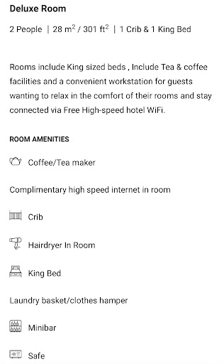 From there I went straight to my room it was up to the standard I expected or imagined though when I was making booking I went through the website just to see what doeâs Deluxe room have , on their official website it says it has a mini bar fridge which upon my arrival it wasnât there