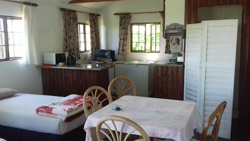 Read moreThe drive up to Eshowe was stunning - hills and trees on either side of the curving road and we were pleasantly surprised by the lack of litter around the informal settlements along the way. ||||On arrival we were greeted by geese, ducks, guinea fowls and lots of chickens, we felt like we were on a farm! The 'Bachelor's Log Cabin' is right at the bottom of the property and has it's own private garden and the most stunning view of the surrounding trees and vegetation. ||||The cabin sleeps 2 - 4 people with a double bed and two singles. It is open plan except for the bathroom which has a room divider that offers some privacy. The kitchen has a large fridge and a freezer for storing your perishables, a microwave, mini stove, kettle and toaster. Aside for a few missing essentials it was ample for preparing basic meals.||||The fowl pen is right next to this unit and we often had the resident guinea fowls and ducks walking right across the lawn in front of us.||||A few not so great features include:||||* We were told there is no direct access to the falls from the resort and that it was a dangerous place to visit by both the owner and a resident tenant. However it was later discovered that you can access the falls from a gate on the property.||||* The heated pool mentioned is on the owner's property right next door and one has to go through his gate to access this and the gym.||||* The kitchen needed a few basic items: Sponge for washing the dishes (there was only a soft cloth available), a rinsing dish, sharp knife, bread knife, frying pan, chopping board and egg flipper||||* The pillows are not very comfortable and you must definitely take your own 2 ply toilet paper||||* No two-pin plug for charging your phone - make sure you pack yours in!||||* Obviously a work in progress, there was quite a bit of used / discarded materials in the garage next to the parking||||* We were so glad we did not stay in the 'Cottage' as this is right by the reception area where you enter the property and has no nice view and a less than desirable seating area.||||The owner was very friendly and helpful and even offered to take us to the falls / Dlinza forest in his 4 x 4 since it would be dangerous to go in a normal car.||||Over-all, although we felt it was a bit over-priced our stay was pleasant enough and we would recommend The Bachelor's Log Cabin for anyone who enjoys greenery and the crow...