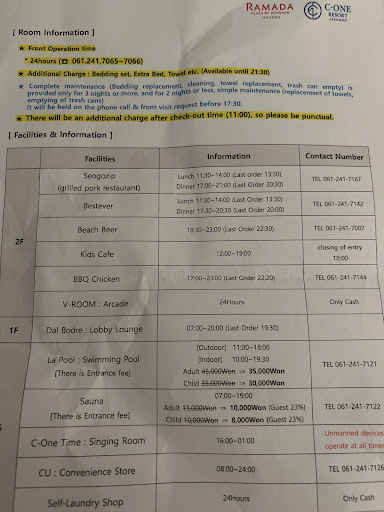 Arrived on a Friday with no expectations. Check in was easy and we received an info sheet with hours for the different amenities and were very shocked to see that it was an additional 35k kwon per person to use the pool. We shrugged it off and decided to enjoy the beach instead. We got to the room and wanted to shower to cool down before heading to the beach and could only find one full size towel and were told it was an extra fee for an additional towel. We made do with out it. Enjoyed the beach and were ready to enjoy dinner but the two places we wanted to visit were closed despite them being listed on the amenity sheet we received at check in. We settled for the Korean BBQ and were sadly disappointed. The portions did not reflect the prices they were charging. We ended up having to go across the hall to get KFC( Korean fried chicken). We also wanted to watch the sunset while enjoying a drink as advertised throughout the hotel but both places that offer outdoor seating were closed.