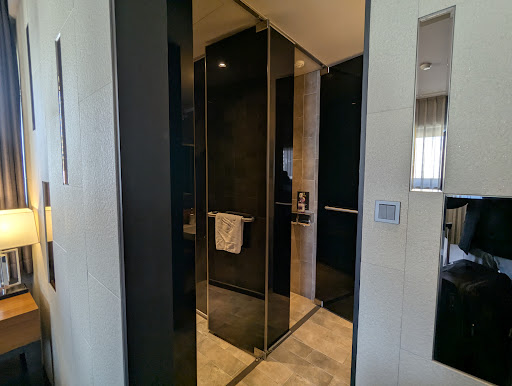 The shower and bathroom has its own door and the sink is outside of them. Theirs is no tub in case you want/need one. The shower head is the rainfall type with a hand-held as an alternative. The pressure from the rain fall was still great. And the water was plenty hot. I noticed that in many restaurants do not turn on the hot water to conserve energy.