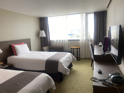 Read moreTaking a risk to stay 3 nights in a row for a hotel. But no regrets, shalom is wearing but very comfy and so convenient to go anywhere. It is my first encounter also to have extra disposable amenities packed up for me when I didn’t request at all. The housekeeping staff are really attentive. A local supermarket just across the hotel where you can get cheap hardtacks and fruits. About 10 mins walk towards city hall I found my favourite eatery where minimum conversation is required for ordering and you can enjoy affordable and delicious meal with banchan. A cheap coffee booth also near the bus stop at city hall. 7 storey daiso at the corner of traffic light. Bus stop is right in front of hotel, need not worry if come back late from sighting. Airport bus will alight in front of hotel. Cross the road board bus, 2 stops to bus terminal and to airport. Hotel reception can help call taxi if need to. Lift can be access without card and room door is auto locked which is not to my liking. The bathroom lights switch are not located outside the bathroom, which is a bit inconvenience. Carpets in room got stains and sofa is wearing, but not too much of a concern for me. Everything else is perfect for me, the bathtub, toilet seat warmer, table space, charging sockets, shower pressure, beds, tea. I opened the window to sleep at night for the cool air, and not disturbed at all by the traffic noise even though I am a light sleeper. Beautiful sunrise...