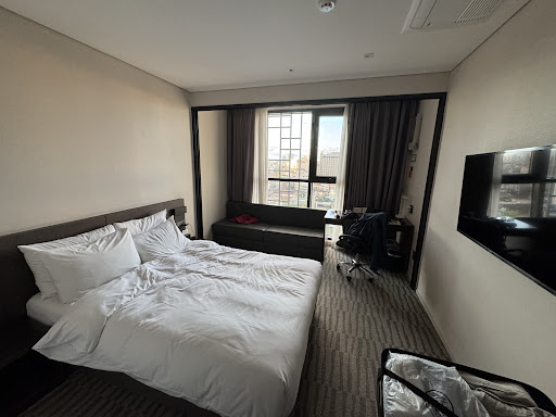 Read moreThe location: an easy walk to the shopping and dining areas (I can recommend Ay Mamita if you want a change from Korean food). ||The room: The beds were comfortable and the bathroom was very nice. The pillows were way too fat (I used my neck cushion instead). Others in our group also complained about this. Toiletries provided include toothbrushes, bulk sized body wash, shampoo and conditioner. Moisturiser was not provided. The worst part was the sensor light in the entrance hallway. It triggers whenever someone goes to the bathroom during the night disturbing the other person still sleeping. Pack something to cover the sensor in the middle of the light and you'll sleep much better! There is no top sheet, just a very thick quilt so you either melt or go uncovered. The fridge is very small with no freezer space. ||The buffet breakfast: Great variety and kept well stocked throughout. ||The fitness centre: Rather disappointing. It was very hot in there. I asked staff for help but that made no difference. There are 2 treadmills, a bike and some free weights but no bench. The treadmills have very narrow running tracks and one didn't work at all as the magnet was missing. Staff just shrugged when asked about this. No water or towels are available in the fitness centre.||The lifts were very slow so don't leave it until the last minute...