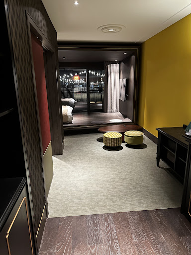The room interior was very pretty, with a double bed in the main room and a single bed in a separate room. It was also very spacious. But I didnโt like that it was very dark, even in areas in front of the mirror where I expect it to be brighter to be able to see myself clearly. I also didnโt like that the shower space had no shower curtains or glass door to prevent the water from splashing into the other parts of the bathroom.