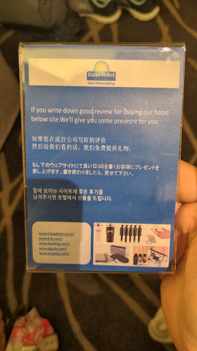 Read moreI wanted a room at a reasonable price near the subway with easy access to the airport shuttle bus and restaurants. This hotel fits all the criteria. IT is on the subway route with an entrance only a minute walk away. The airport shuttle bus is also just a quick walk down the street. It is in the Myeongdong area, which is full of restaurants, shopping and street food at night. The staff was friendly and the room was very clean. The entrance is not easy to see as it is not a independent free standing building, but part of a building complex so it is a doorway with signage. I opted not to have my room made up every day but they still dropped off fresh towels and bottled water (free water) in front of the door which was a nice touch. It was a good value for the price. In the photos you can see the street location , which is busy even when I arrived at 10:00pm, and full of retail and office buildings. The street vendors, restaurants and shops are located in an area behind the hotel. Again just a minute or two walk away. The whole area looked clean and safe. Subway: One transfer when coming from the airport so very easy to navigate. From airport you travel to Seoul station which is about a dozen stops then 2 more after the transfer. It is a good distance and took close to an hour. Really low cost, thinking it was under $4:00 US. The airport shuttle was more, 17,000 so about $13.00 US and closer to 1.5 hour drive. I believe the stop almost in front of the hotel was #10 with the Shuttle around subway stop #9 as...