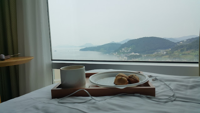 We had a group of about 200 people and utilized the Grand Ballroom for a banquet. The staff provided excellent service throughout. The hotel was recently constructed and very clean. Its staff had even decorated the lobby for the holiday. My 12th floor room had a great view of the bay. There were both 110v and 220v outlets right above the desk. The room was equipped with a hot water pot, cups, mini-fridge, hair dryer, and free WiFi. It also had 2 closets, one with 6 hangers. The bathroom was equipped with a 220v outlet, heated Novita toilet seat, 2 large bath towels, as well as 2 smaller ones. As the hotel sits atop a hill, facing the bay, the restaurant has a great view of the bay, as well as many of the rooms. The food was delicious in both our banquet and the restaurant, which offers both Western and Korean cuisine. For the bride and groom to be, reservations for weddings are available at the hotel.||||There is a large, luxurious sauna located at the nearby Condo building, along with shopping, eateries, and a family water park (no beaches in this area). The hotel has a golf course just 15 minutes away. There are many small shops and coffee shops right down the hill. Several points of interest are within 20 to 60 minutes of the hotel. For conferences and business people, there is a business center on the first floor with 2 computers , a printer/copier, and halls which have a stage and seating capacity (Grand Ballroom 700-1200, Emerald Hall 200-300). The Condo building has additional halls and...