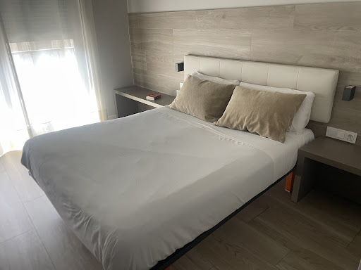 Stayed here last night with 4 friends all on motorcycles. On street map the building is a bank but that's because it's only been a hotel for a year or so. ||The receptionist was helpful - we were running late and she called to see what time we would be arriving as they usually close at 10pm.||Very helpful showing us where to go to get a late night drink and explained everything really well.||The rooms are arranged over 3 floors with a decent lift. They are all very well appointed and it's clear everything is quite new. Very modern design in a sleepy town.||All the rooms are doubles which caught us by surprise as we were 5 lads expecting to share but we managed to get 2 more rooms on the night.||There is unrestricted parking outside, we parked 5 bikes on the square outside the hotel - I could see them all from my room so that was super easy.||Breakfast was basic but at only €5 it was decent value and we were well looked after. ||All told it was a surprise to find such a modern and well presented hotel in a relatively small town.||I would stay there again without...