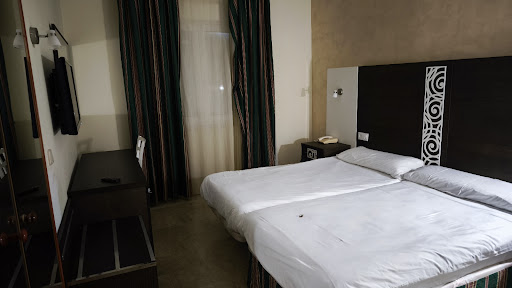 Read moreHôtel avec un design ancien mais globalement très agréable. Cependant, lorsque nous sommes arrivés avec ma compagne, nous avions l’impression que notre présence n’était pas vraiment réjouissante. Ajouté à cela le fait qu’aucunes informations sur le fonctionnement de l’hôtel nous a été transmis (horaires ouvertures des services etc). Une fois à l’intérieur de la chambre, le lit est très confortable et assez spacieux, il y a un grand bureau où poser des affaires et une armoire plutôt grande. Au niveau de la pièce où dormir, disons qu’il n’y a rien à redire. Par contre, les problèmes arrivent au niveau de la salle de bain. Nous avons pris une douche de manière tout à fait normal, et premièrement si l’on veut avoir de l’eau chaude, il faut savoir que la pression de l’eau est extrêmement faible, et rien de plus désagréable que de se doucher sans avoir de pression. Deuxièmement, à notre grande surprise, lorsque nous avions terminé, l’eau de la douche avait complètement inonder la pièce, et en effet lorsqu’on regarde les joints au niveau du sol, ils étaient décollés. Je veux bien qu’il y ait des défauts mais la moindre des choses c’est de nous avertir afin de faire plus attention. Nous avons dû mettre une serviette pour éviter que l’eau sorte pour les utilisations suivantes. De plus, il est important de savoir que le matin il y a beaucoup de bruits dans les couloirs, les personnes ne se privent pas d’élever la voix, ce qui est très désagréable. Ensuite, au niveau des services que propose l’hôtel, nous avions décidés de nous rendre à la piscine le samedi en début d’après-midi, premièrement il faut savoir que celle-ci n’est pas ouverte tout le temps, les horaires sont à l’espagnol donc il faut faire attention (ex : pas ouvert au milieu de l’après-midi) et deuxièmement, point que je trouve le plus inadmissible, on nous informe que l’accès a été privatisée pour une occasion particulière. Donc nous payons un hôtel avec piscine quand celle-ci est privatisée par des personnes extérieures ? Nous avons donc pu profiter de la piscine que le dimanche matin et pendant un court instant puisqu’il fallait rendre les clés à 12h. Également, en tant que français et pas forcément habitués au rythme espagnol, nous avons voulu prendre un petit verre au bar aux alentours de 12h mais celui-ci était fermé, quelle déception. En conclusion, cet hôtel est bien pour faire une escale lors d’un long trajet mais je ne le conseillerais pas forcément pour des...