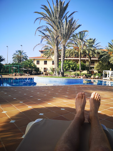 Read moreWe stayed here for a week in September (fairly last minute decision).||Neither of us are golfers (though we did take advantage of the facilities and had a basket or balls each on the driving range).||The hotel is beautiful - the reception area and the quadrangle courtyard where you can sit on the evening listening to the wind through the tall palm trees or enjoy the evening entertainment (3 times in the week we stayed).||The staff are tremendous. All happy, helpful and work very hard.||We stayed half board - the breakfast was buffet style in the ‘19th Hole’ with the evening meal on the St Andrews restaurant. Starters are buffet style and different each night - as are the desserts. The main course is à la carte. The food was excellent.||Drinks prices and ‘bar snacks’ in the 19th hole are reasonable - especially as you are pretty much a captive audience. There is a shuttle bus but the times are not really compatible with going off site for the evening - that said, taxi fares are reasonable (€5 each way).||The hotel is a couple of miles from the beach or the main town. We walked a couple of times and used the shuttle bus but we mostly stayed on site.||The pool is fabulous and the regular lifeguard is always keeping it clean and tidy. We also had the benefit of a duck having made a nest on the island in the middle of the pool - I hope the duckling and are now hatched and ok!||Plenty of sun beds and Balinese beds. The pool is lovely to cool off but not much of a swimmers pool. There is no pool bar as such but they will provide plastic glasses at the 19th hole if you ask.||We thoroughly enjoyed staying here for a relaxing stay. ||Personally Im not sure I’d go to Fuerteventura again but if I did - I would definitely stay here again - it is a lovely hot and the staff...