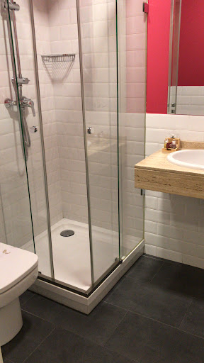 Maybe it was slogging through the rain all day alone. Maybe it was the interminable walk into the town with no signage toward this rather prominent place in town. Maybe it was the odd feel of the town itself down block after block of strange wild-west-like structures - I don't know. But I just couldn't warm up to any of it. It was the feast of Corpus Christo and the whole town was out in the bars when I arrived, making getting checked in at the busy bar and getting through the crowded bar itself a challenge. I had wanted to pay so could leave early the next morning, but the staff wanted to show me how to get up to the room first and getting BACK through the packed bar was impossible. As seems to be the case everywhere, there is no printed information in the rooms even in Spanish. There may have been other peregrinos there somewhere, but it seemed overwhelmingly local. I begged the basic dinner information via Google translate from the wait staff in the second floor dining room that wouldn't open until much later. Since the downstairs bar was bursting at the seams and there were no tables (and for some reason it seems like women aren't supposed to sit at the bars in Spain - I never saw women doing this anywhere in Spain in two month-long trips on the Camino and when I tried to sit at one, invariably I was redirected to a table), I went out into the town into another place full of locals and sat down - no menu and after sitting there for perhaps 10 minutes as the waiter flew around trying to get people taken care of, I left. The very same thing happened at the next restaurant I stopped into. I gave up and went back to the hotel bar (restaurant) and although sat down at the bar, was shown to a little table half-blocking the busy exit where the bar staff ran in and out with drinks and food. Having been sick, I wanted some hot soup, but was told this was not possible without ordering from the other categories on the menu del dia, which I didn't want, so I ordered the croquetas casera because they are sometimes good and they are served hot. What I got literally had frozen chunks in them. I ate half anyway and went to the room to wait for time to leave the next morning. The bed was very comfortable and the room was done in a sleek, monochrome white style. ||||They did have a lovely glassed-in porch off the room which was good for drying clothes in the sun when it finally came out. The next morning I wanted to leave early as had a long way to go, but at 0715 (late by peregrino standards), the staff hadn't arrived and the person cleaning indicated that I should wait. When the bar staff arrived, the person cleaning told her I was waiting to check out, but she continued to go about setting up breakfast even though I was standing there with my payment. It turned out they needed something for the cash register, but there was no attempt to explain. So I waited and waited and maybe 30 minutes later succeeded in getting out of there. The next day's walk is lovely, so if I pass that way again, I would stay at the nice-looking albergue at the exit...