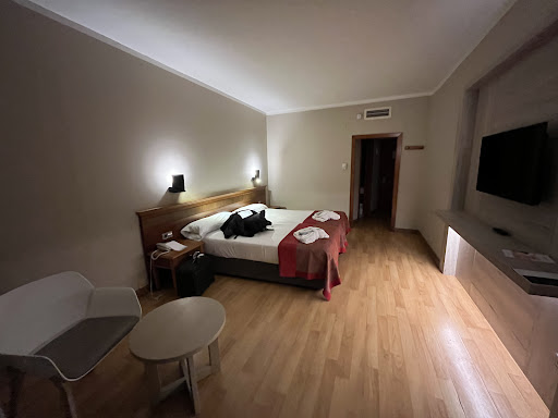 Let’s get the negative out of the way first. We stayed in a room with ‘partial sea view’ and you should indeed be alarmed by the vague language used. ‘Partial’ is certainly technically true but let’s just say there wasn’t a whole lot of sea to be seen. Next the room itself. It looks more or less like the one pictured but what they did not show was the mold on the wall behind the curtain, the bad smell of the room, the just absolutely awful smell of the pillows (about 10cm thick so prepare your neck) and the blankets, the bad mattress, and the just general bad finish of the room (misaligned flooring, cracks in the walls, beds that feel like they are gonna fall apart anytime and so on).