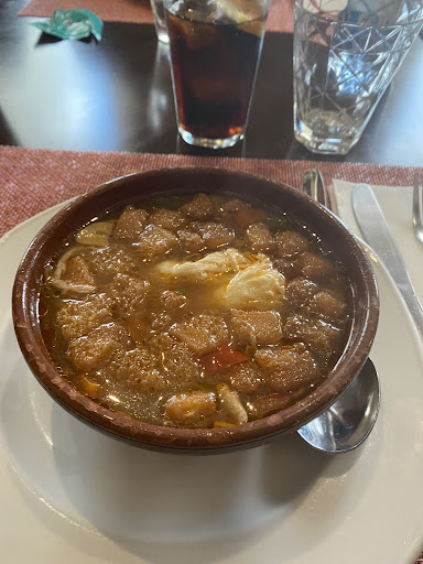 Read moreIsst so Spanien? So schlecht, nach dem Motto. Quantität vor Qualität? Wir sind auf diesen Landgasthof /Hotel gestoßen, weil in den umliegenden Ortschaften, so gut wie keine Restauration verfügbar war.||Das El Patas wurde mit dem Hinweis empfohlen: Hier essen die Einheimischen. Was wohl stimmt. Als wir ankamen, war zwar nur die Bar - , aber 20 Minuten später, auch der riesige Speisesaal, voll. ||Die Bedienung, scheinbar die Chefin, war sehr freundlich. Wir bestellten Salat, Solomillo und Kotelett. Das Essen kam relativ schnell, Riesen Portionen Fleisch, dazu einige, na ja, matschige Pommes. Allerdings ging mein Solomillo erstmal zurück. Fast roh. Wenig später brachte es der Patron zurück und wartete auf mein okay. Gut, jetzt war es, wie bestellt ,gegrillt. Leider aber war das Fleisch, wie auch das Kotelett zäh, bis ungenießbar. Die um sitzenden Spanier, viele aßen das gleiche, schien es nicht zu stören. Obwohl alles sehr preiswert war. Das war absolut nichts, so isst der Spanier, auf dem Land ,...