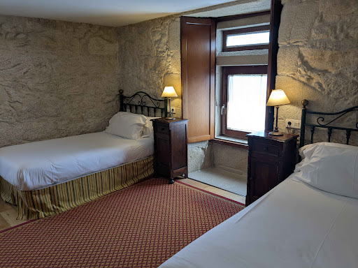 Lovely characterful, peaceful hotel in a fabulous setting. Great morning and evening views from the room - our bags had been moved to our room before we arrived which was a nice touch. The breakfast was varied and very good. The hotel restaurant food was also very good indeed. We would definitely recommend the hotel and we would come back again.| |It may seem churlish to mention the very few less than ideal aspects but for those looking for detail prior to booking those that there were, were as follows: drinks at the bar were far too expensive and the swimming pool water was so icy (late September) it was almost impossible to use - despite it having been very sunny all day and all week prior to arrival. The hotel restaurant produced superb food though it took over one hour between ordering and the starter to arrive - we were hungry and also keen to get to bed early for the Camino de Santiago so that was a little irritating. However the kitchen staff brought one or two canapés to try and ameliorate the slow service. And having said that, our starter (a salad) was the largest plate of really excellent salad treats I have ever seen and would have sufficed for an entire meal without having a...