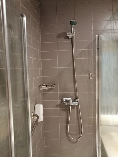 2.El baño de la habitación sigue la tónica: una ducha muy pequeña. La encimera tenía unas manchas enormes amarillas y el espejo estaba descascarillado por el perímetro. Adjunto fotos. Es inaceptable para haber pagado 234 euros la noche (media pensión y acceso al balneario).