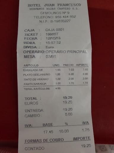 We intended to stay only for three nights but due to work commitments we had to return early. If work hadn't have called we would have stayed for a week or even more. Its very difficult to describe the lovely ambiance of this little hotel, the owner,the staff, his family and some of the locals felt like old friends after the first hour, they couldn't do enough for us.The room was large and comfortable, The food was amazing and the menu del dia was only 10 euro for about 7 beautifully cooked and prepared courses, although it shows 20 euro per person on the website it is only 10. In addition veggies and vegans are well catered for. Only a small point but important to me was that they had FRESH milk, which is amazing to find in a hotel / restaurant or bar these days, I loathe UHT milk so I was thrilled. With each drink ( inexpensive ) a tapas was served, including one of the nicest garlicky,parsley,fried squid served on lettuce I have ever tasted, I am going to ask Juan for the recipe it was that yummy.I wont go on and on although I could, you will never regret booking into the Juan Francisco and when you do please say hi to them from Steve and Davina we shall...