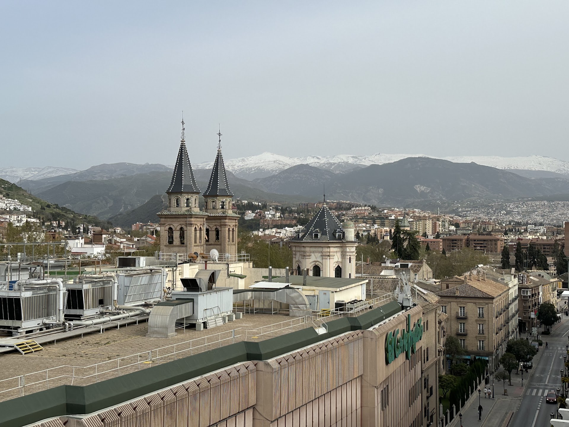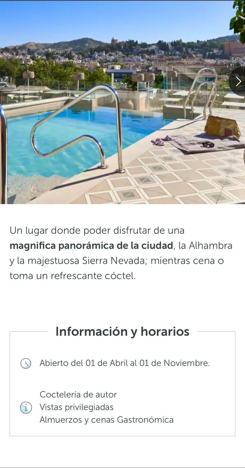 This is a nice hotel for a short break. It seems to be a pretty typical city centre hotel. Well located. Reasonably furnished and quite busy. Our room 551 was a standard double. Not a bad size. Nicely decorated with very good lighting and mirrors. Well kitted out, large bed 7ft, tea making, large telly, nicely presented walk-in shower, safe etc. so no complaints because to be fair this place is very reasonable. ||There is a roof top terrace, which is really a roof top bar area, it’s taken up mainly by tables for drinks, there is a very small pool and a sun deck with about 12 sunbeds and a few deck chairs. Obviously these get taken up quickly so the chances of using the sun deck and pool aren’t that great. It’s all a bit too tight to be pleasant. I’m not sure why they’ve got quite so many tables and chairs a large part of that area could be used for sunbeds, clearing them away later in the evening if they needed. The bar staff on the rooftop don’t even come up onto the top sun deck to offer drinks. I think they’ve got it too easy, each time we were there there were hardly anyone at the tables. ||Now on my second night here’s the gripe… why close the roof top bar at 9pm and make last drinks served at 8.15pm. That means the bar is virtually unusable as an after dinner destination. On our visit we pushed for and got a drink served at 8.20 but were told we must leave at 9pm because there was a private event to follow. Part of the reason we booked this hotel was the rooftop bar. Then to rub salt into the wound they said in 2 weeks after our stay the bar would be open until 2am!! |So it extends from 9pm to 2am. This should have been made clear at the point of booking.||By the way you need to collect pool towels from reception. ||Anyway first off make sure you enter the postcode for the hotel in Google maps Not the car park. You need to park up and get the valet to park your car underground. Google was totally confused and sent me round the houses trying to get to the garage I think it thought I was driving a pony and trap, we went up some very narrow streets, with almost impossible turns, to the point I couldn’t go back and had to go into a restricted road just to get out of there (I’m expecting a fine). We finally made it to the garage and on pressing the buzzer the hotel said I needed to back up and come round to the front of the hotel so the valet could park it!! I was already there. Anyway that’s a warning do not try to park your car yourself at the hotel car park. ||We walked to the Cathederal from the hotel (less than 10 mins), it was impressive. Then spent some time walking the narrow lanes with their ‘souk’ style shops.||Generally I’m happy with the hotel, especially for the price. Ok our room has no view, and the rooftop terrace looks down into the air conditioning units of the Corte de Inglés opposite, but that’s what you get in a city. ||Grenada on first impression seems a bit grubby. It appears that it has been allowed to develop without any control so the fantastic historical buildings are surrounded by, ugly apartment blocks, shops and offices. So as a city it’s not as attractive as say Malaga. ||But that’s just my impression. Others I’m sure will love it. ||But if you decide to visit this hotel it is ideally located and seems clean and secure. The front desk staff by the way were great at check in. ||We went to the Alhambra Palace buying tickets before we travelled to Spain. Turns out our tickets didn’t include the Nasrid Palace, just the Carlos V palace. I suspect that is because spaces are so limited and you need to book well in advance. So make sure you check what you’re actually paying for, our two were €150 and obviously didn’t include everything. Having said that the gardens and the palace and buildings we did see were good, I’m not convinced the place warrants the high entrance price, it’s good but not spectacular, some of the local churches and cathedrals are better and offer free entry. |You should get a taxi to the Palace entrance and preferably back it’s quite a steep hill and long climb. Also remember to bring your Passports with you for each member of your party. I don’t know why but the Spanish insist on it and won’t let you in with just a ticket. ||So overall a nice, busy, city centre hotel. Offering excellent value. I would book again and recommend it. ||Not sure I’d recommend Granada though. Malaga is...