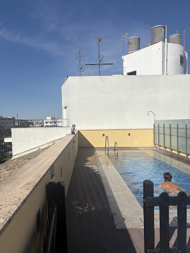 Read moreArrived in Jerez by train from Cadiz ( €4.50 p/p) ( 2 coffees and 2 iberico ham tostadas for €10 at Cadiz station)|The hotel reception staff gave a warm welcome and offered to store luggage safely. At check in I was told the room was ready so no need to store luggage. I upgraded to a family room which had a sofa/ sofa bed room with fridge, mini bar, kettle station and local info. Then a spacious bedroom with seating area, and further area for storing bags, with safe and hanging space. The en-suite was large with double sink, walk in shower, bath, loo and bidet, plenty of fresh towels, gowns, slippers, toiletries and hairdryer.| Breakfast is available for €14 p/p.|The reception area had plenty of comfy seating, lots of tourist information and an afternoon station with coffee, water and cakes available. |On the roof was a small pool and decking area with seating and a few parasols.|Lifts to all floors. A perfect city hotel only yards from the main square and good...