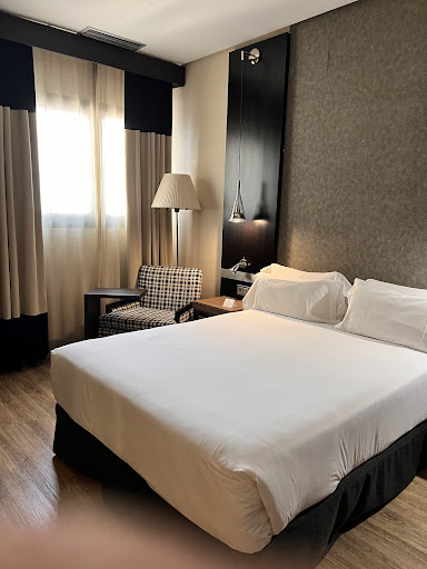 Decided at last minute to visit La Feria so basically had to take what was available and pet friendly. Pleasantly surprised, a modernish well appointed hotel, conveniently located for the showground and in a nicer part of Jerez.||Reception staff were very nice although not particularly efficient, three receptionists working at a desk in front of which only one guest can stand, hopefully the genius that designed has realised their true vocation lies elsewhere,||We had a nice room on the top floor overlooking the main road and had no sound issues although some interesting views.||Parking garage is a bit small but patience and power steering won the day.||We had a special card to dangle on our door handle informing anyone interested that the room was occupied by a dog. Also, a nice touch, they brought us a dog bed and a dog toy.||A comfortable hotel with nice staff that provided us with an enjoyable stay, Given the choice would probably stay elsewhere but would not object if circumstances dictate that we had to...