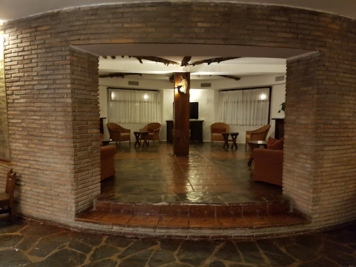A pleasant ambience in the Castillian style, full of stone, tiles, wood and wrought iron with a strong hunting theme including, nowadays, on the restaurant menu. We've often stopped here for a drink, occasionally a meal and this time an overnight stay with the dog.||The accomodation is accessed from the rear of the main lobby and arranged round a square of grass, trees and sculptures. A delightful room with access on the far side to an optional personal garage for your car (in addition to the open air parking round the side of the hotel). The fire escape plan in the room shows route 1 back through the main hotel and route 2 through a gate in the far corner of the plaza which on our visit was chained up and padlocked (see photo). I had a good look round and all other possible exits were also chained up, apart from one kept shut by what seemed to be a pair of strong magnets. Maybe in the event of a fire they would open? However this gate is not marked on the map and would be unlikely to be discovered in an emergency. In the event of a big fire in the main building you would have to stay in your room until the fire brigade turned up. Unless you had paid the extra ten euros per night to use the room's garage.||The restaurant menu includes partridge, venison and an underwhelming rabbit and rice dish. I had the partridge which is difficult to find in Spain except when it's in escabeche. Like another reviewer, mine was missing half a leg. Not a problem for me, and I am not expert enough to tell whether the bird was farmed or shot in the wild. I enjoyed it but the potatoes and vegetables were lukewarm. I can see what other reviewers mean about chaotic and slow service but that was not generally my experience on this visit.||Definitely worth a visit unless you are in a rush or don't...