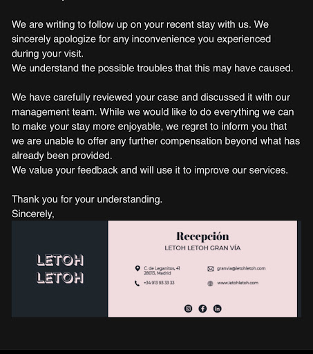 Read moreRecently checked out this morning, upon our stay we had no hot water yesterday and due to this we were unable to shower and leave hotel to attend our booked tours. We lost over 200€ due to this inconvenience. Shower in room 113 also leaks front right corner, toilet isn’t fitted secure & rocks side to side (unlevel) poorly built. All we were offered for compensation was 5€ breakfast at the cafe although we had to leave before Cafe was open to catch flights. Which doesn’t cover the costs and time we have lost. Our stay in Madrid was apart of our honeymoon and this experience ruined our stay.