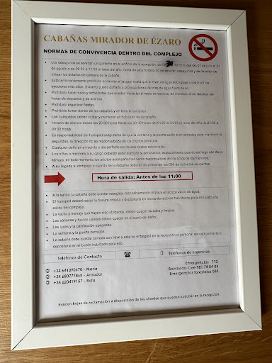 Lo primero decir que es súper recomendable ir a Ézaro y alrededores porque es precioso, estas cabañas sinceramente no las recomiendo, la ubicación es muy normal y las cabañas muy cutres , precio de 5 estrellas y te encuentras un autoservicio que casi te piden que les dejes la habitación preparada para los siguientes (leer en la foto el apartado de salida) cogimos la “mejor habitación” con “vistas al jardín” 170€ noche nos dieron una cabaña llamada Noa , vistas a ningún lado, cama de 150cm, y tienes que llegar como muy pronto a las 16:00 y salir como muy tarde ANTES de las 11:00 (cosa que no sabíamos), en el proceso de reserva te informa de la hora de entrada pero no la de salida, al igual Que en el WhatsApp que te manda el dueño un tal Rafa, te explican todo menos la hora de salida, era la 13:00 y la chica que se encarga del mantenimiento nos avisó de un escobazo en la ventana mientras estábamos relajados que nos teníamos que haber ido a las 11:00, después descubrimos que el horario de salida está en una pestaña que tienes que abrir en booking donde pone condiciones y en un cartelcito en la habitación , ese fue nuestro error ir relajados y confiar en que más o menos la hora de salida se ACERCARÍA a las 23h desde el ingreso como en cualquier hospedaje, el dueño le echa la culpa a booking, que le reclamemos a ellos, cuando el también omite la información de salida pero si te dice la de entrada , sinceramente si llegamos a saber que tendríamos 19h de hospedaje por 170€ no hubiésemos ido, tal vez para más de una noche no te importe, pero para desconectar un día no compensa, la típica decepción explicada en la letra pequeña y al llegar al sitio. cero contacto humano el cual puede llevar a estos malentendidos, Un autoservicio en toda regla , pagas precio de hotel 5 estrellas pero tienes que dejar todo fregadito, sacar la basura, sacar la ropa de cama y toallas y dejársela en otro lado, como en tu casa vamos! Al desayuno que teníamos incluido ya ni fuimos , visto el nivel ,colacao y tostada con mantequilla 😂 un chollo para los propietarios, una para aprender 😌 el error quizás es estar acostumbrado a servicio y horarios de hotel (no se hasta que punto es legal alquilar 19h lo normal en hospedaje son 22h, pero esta gente aprovecha en no contratar personal y si tienen lleno, la misma persona les limpia todas las cabañas en esas 5h y así le da tiempo a que llegan los siguientes, hay gente que solo ve hacer caja y como todo, mientras...