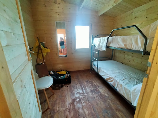 Actualización 24/08/22. Ante la respuesta del camping: No se trata sòlo de hacer "algunas mejoras", se trata de cobrar por lo que se ofrece. En mi reserva figuraba una cama doble, vistas al jardín y aire acondicionado en la cabañ. Ninguna de las tres existen. Eso se llama publicidad engañosa y estafa, porque 190€, para dos personas, dos noches en un camping de 2a categoría, no tiene otro nombre. La cabaña no tiene cama doble, aire acondicionado ni vistas al jardín (no nay jardín ni azotea verde). Tampoco tiene papelera, ni ganchos o toallero donde colocar las toallas húmedas Las duchas son comunitarias, sin separaciòn del área de WC, sin ganchos ni lugar donde colocar el neceser mientras te duchas. Los fregaderos están sucios, sin espacio para dejar los enseres, sin grifos, son llaves de paso de tuberías por lo que al abrir el agua sale en todas direcciones. El camping no tiene piscina ni bar per se. Esta al lado de las instalaciones municipales (canchas de fútbol, pádel, frontón y psicina). La estancia te da acceso a la piscina, que tiene un bar público Por lo que ambos espacios están abiertos a todo el.mundo, por un lado habiendo ruido constante de gente y por otro la dificultad para consumir en un pueblo que sòlo tiene 4 bares más, dos de ellos cerrados y los a otros sin gran oferta.. El sábado pasado no pudimos cenar en el bar de la piscina porque estaba todo reservado por gente del pueblo y el trato tampoco fue muy amable. El muro del recinto del camping no está cerrado, en su parte posterior falta una pared, habiendo un hueco por el que puede entrar un camión pequeño y que da directsmente al campo. Por la parte que da a las instalaciones deportivas también falta una pared, así que cualquiera puede accáer. De hecho el sábado hubo chavales de la zona del bar usando los baños del camping.