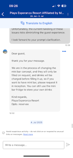 What I didn’t like (and future guests should be warned!) Playground under the sun. Hardly any shade, few swings; one swing constantly stood in a puddle that attracted bees. Dinner drinks = extra charge. No tea or coffee at any price. Kids don’t drink beer or ice-cold cola – at least provide hot tea! Language barrier. Restaurant and housekeeping staff speak almost no English. Asking for “hot tea” took mime-level explaining and still brought a bottle of iced tea. Housekeeping glitches. Towels disappear and reappear; shampoo refills are hit-or-miss. They burst into the room without knocking! Twice, even with “Do Not Disturb,” once catching me naked, just to ask if I liked the cleaning. Unacceptable. The great “new minibar concept.” Day three: a manager walked in unannounced, grabbed every drink from the minibar and said, “The boss decided minibar is now pay-as-you-go. Pre-pay at reception.” Minibar was clearly included in my rate! Reception surprise on arrival – a story you need to know. • Arrived 11:00; keys promised four hours later “because of cleaning.” • Told my room was on the ground floor, and offered €250 (later €50) to move up “for the maids’ double work.” How can it be double if I hadn’t even checked in yet? • Hotel support later confirmed “Yes, €50 is normal.” • In the end, junior suite 2004 does have a lateral sea view – but I learned that only at 14:00 when I finally got the key. A simple “Your room has sea view” at the desk would have avoided all drama. • Important: while I was arguing, two couples beside me said they’d been offered the same “extra-floor fees.” Not a one-off. Compare with the neighbours. At the Iberostar next door no one demanded “floor surcharges” or barged into rooms – true guest-oriented service from the first minute.